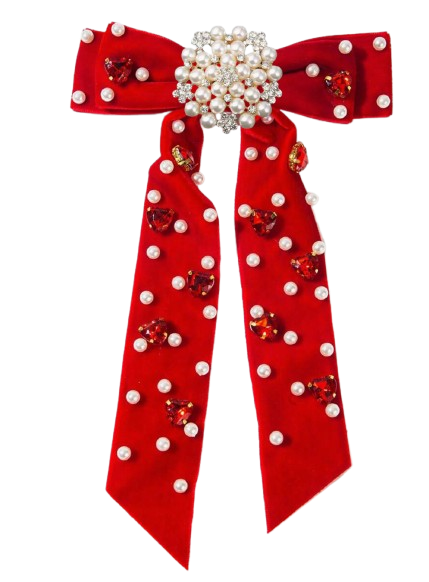 Elevate your pup’s holiday style with the Christmas Couture Bow, a luxurious statement piece crafted in soft velvet and adorned with radiant pearls and ruby-toned gems. Finished with a dazzling pearl cluster centerpiece, this bow captures the magic of the season with every sparkle. Available in 3 colors: red, pink and black.