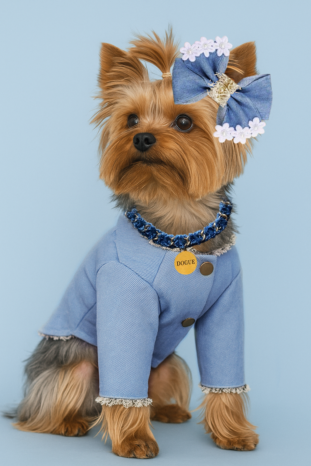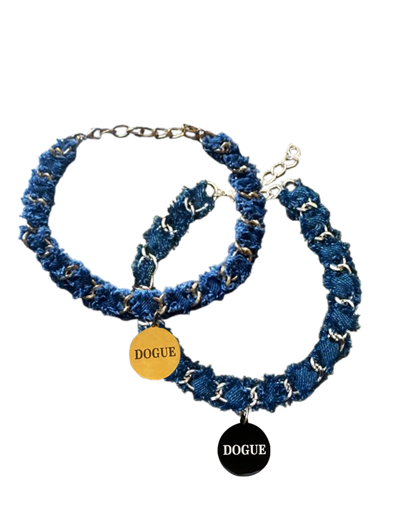 Turn every sidewalk into a catwalk with this Denim DOGUE chain This plush, lightweight, denim-and-gold woven necklace features a signature DOGUE tag and Parisian-inspired charm. It’s lightweight, glam, and perfectly paws-itively posh for everyday strutting or special occasions.