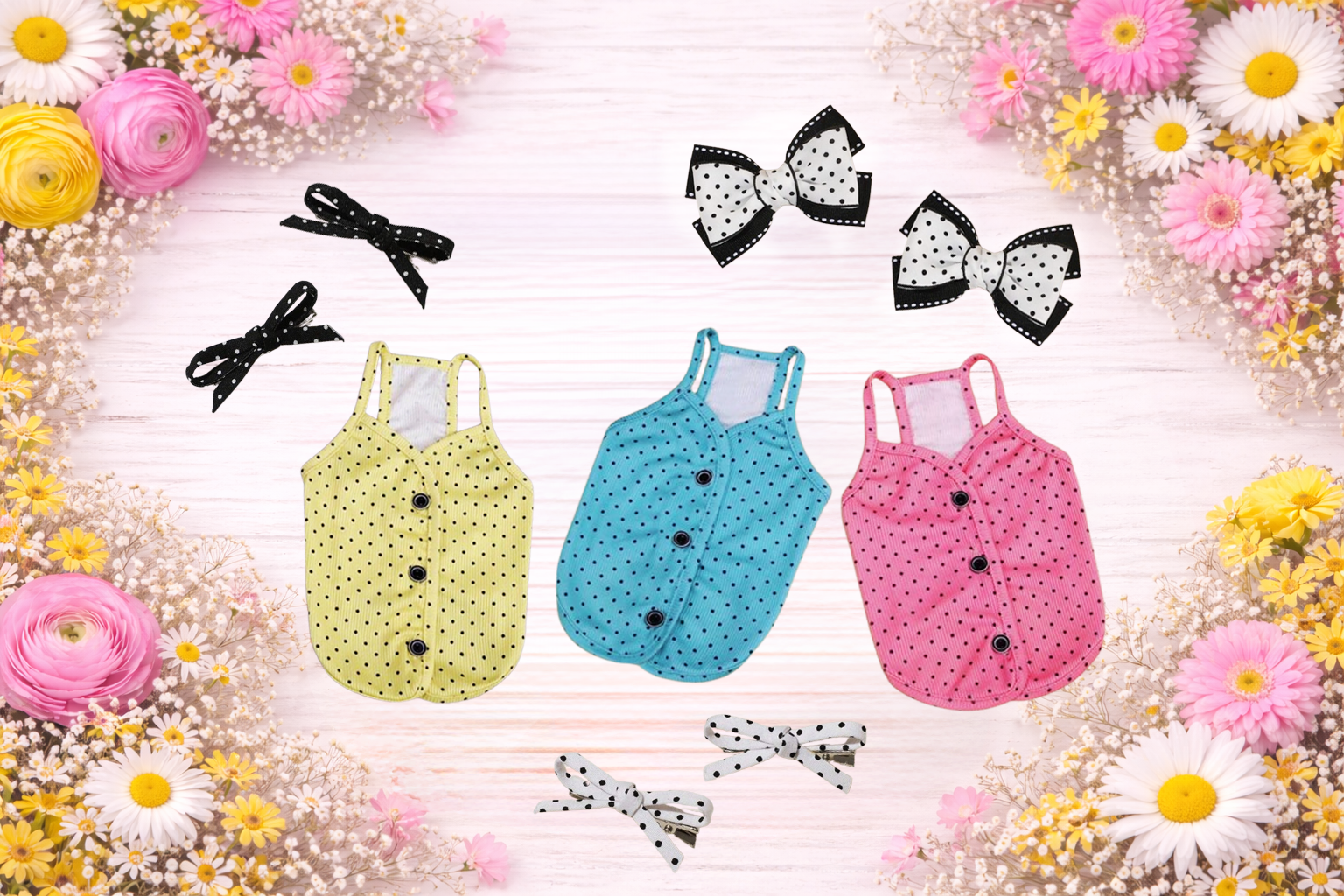 Spring Polka Bows — a timeless touch with a playful twist. Designed in soft, airy fabric with delicate polka dots, these bows come in two styles: a sleek, thin silhouette for an understated look, and a regular size bow for a statement moment. Perfect for adding a hint of charm to the Spring Polka Dot Tank Top!